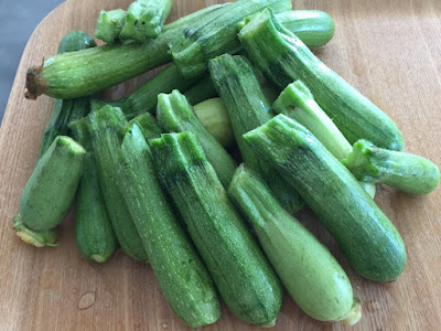| これが、今年のズッキーニの最終収穫だった。 この小さなズッキーニは、皮をつけた状態で5本使った。 |
