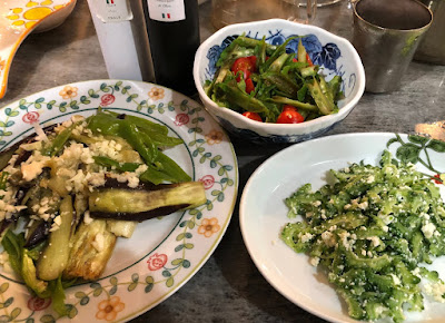 | 今日収穫した野菜でオクラ以外はすべて食卓に上がった。 |