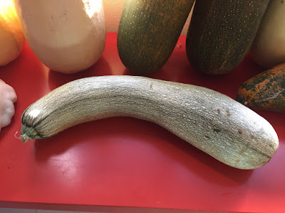 | こちらは10日前の写真。30cmくらい? 種取り用にしては若干小ぶりのズッキーニだ。 |