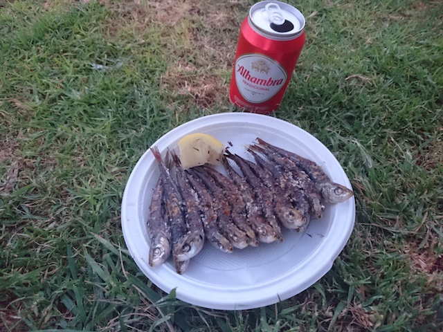 トップレスの女性が日光浴をしている浜辺ではでは名物のイワシの串焼きを食べ、