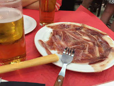 タパスというスペイン人の生活に欠かせない居酒屋兼軽食堂では、魚介類やハムなどをたらふく戴いた。