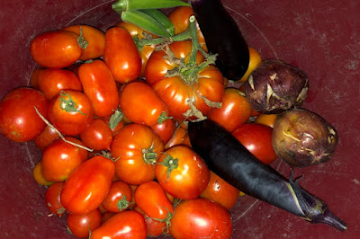 | トマトは弱った苗が増えているが、まだまだ大豊作が続いている。 イチジクは、その場で3個食べ2個持ち帰り。 |
