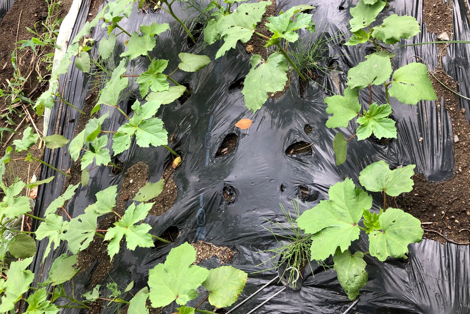 | 最初に種を蒔いたオクラは、まだ50cmほどの背が低い苗。 それでも、2日に1回くらい1本の苗から1個は収穫できるようになってきた。 これから苗の成長とともに収穫量は増えてくるはずだが、害虫被害も心配になってくる。 |