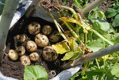 | ここは土嚢袋で育てている男爵芋。 3月末は遅霜被害でどうなることかと心配していた。 |