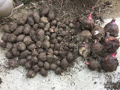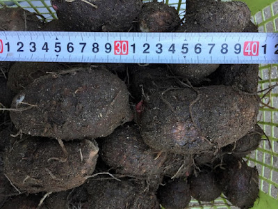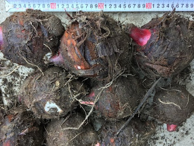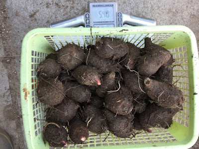 ということで、まだ台所に食べるのが残っている小芋の方は、もうしばらく土の中に保存していたかったのだが、親芋の植えどきを考えると、土の中に保存していた2株の掘り出しは今日がベストだ。