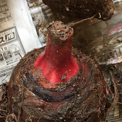 | このピンク色が、「赤芽大吉」の特徴。 このウェットな部分をしっかり乾かした後に植え付けする予定だ。 |