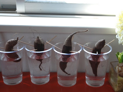 | こちらは、昨日始めたサツマイモの芽出し実験。 ここに置いている芋は「パープルスウィートロード」か「紅はるか」のどちらかだ。 切らないで外から見ても、芋の種類の区別は出来ない。 |