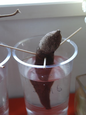 で、私も初めての試みなのだが、小さいために食べられることなく、冬越し出来たサツマイモをプラスチックコップに入れ、芽出しするかどうかを見てみることにした。