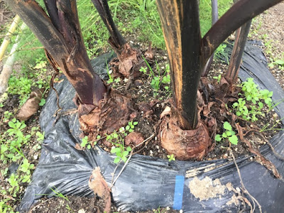 | このこげ茶の茎元は『元々あった里芋』 逆さ植えの時は、伸びた茎葉の下に4個くらい大きな親芋が出来ることが多い。 順行植えと違って、それぞれの芋に距離ができるので、小芋がたくさんできるのだ。 |