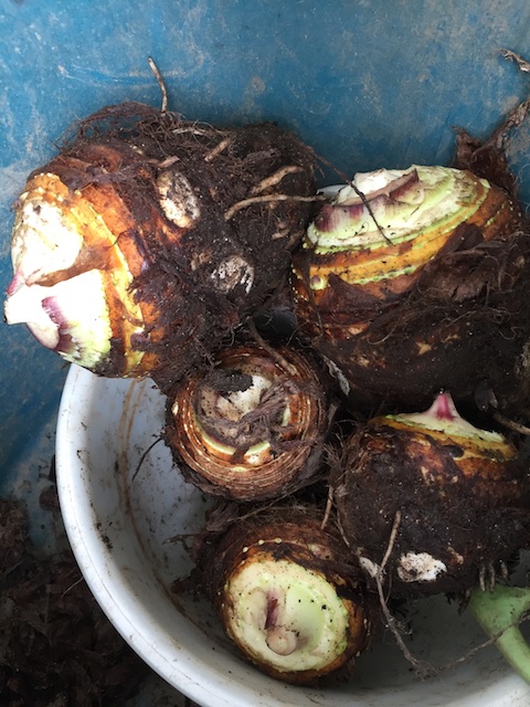 里芋はこれまで、第2菜園にある小さな親芋を順行植えした株を、10月の初めから食べる分だけ掘り起こしてきた。