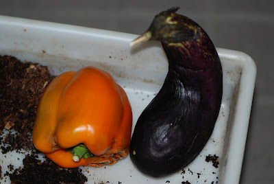 ということで、今回は食べやすそうな餌、茄子と色ピーマンを前回の食べ残しのジャガイモに加えて観察小屋を再設定した。