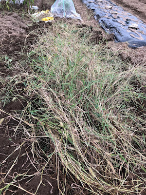 | 準備する畝には、最近の畝作りの恒例で、近くの雑草を敷き込んだ。 |