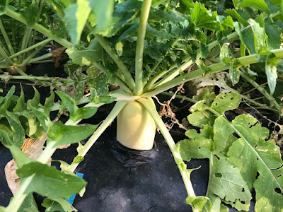 さて、聖護院大根は、マルチから一部顔を出していたら大きさが想像できて収穫しやすい。