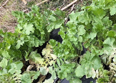 | こちらはサツマイモを収穫した土嚢袋に遅めに種を蒔いたもの。 こんな苗では今から収穫が始まり、2月いっぱい収穫できると思っている。 |