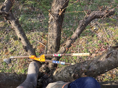| 木に登ると言っても、何メートルも登るわけではない。 私は鈍臭いので、木の上での作業は他人には絶対見られたくない姿だ。 |
