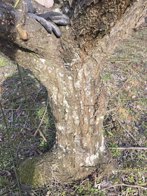| こちらは大梅の木の幹。 小さな苗を植えて25年前後だろうか?その幹は大きくなったものだ。 大梅は3本あるのだが、3本とも幹は20cmを超える太さだ。 |