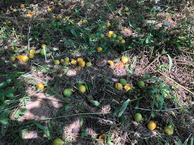 今日梅の木のところに行ってみると、木の下には、落ちて間もないと思われる青い梅や、もう落ちてかなり日が経ったと思われる黄色くなった梅がたくさん転がって、甘酸っぱいいい香りが辺り一面に漂っていた。