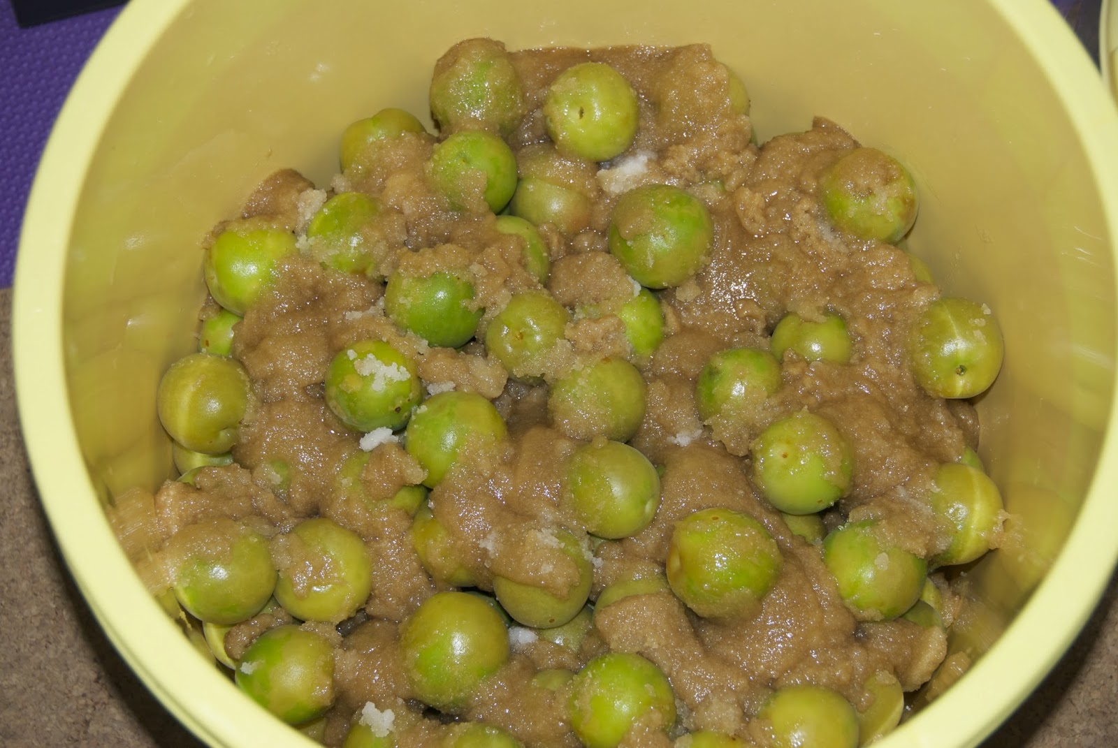 梅が10kg,これに塩1000g、更に砂糖700g、そして焼酎を220mlを加えた。