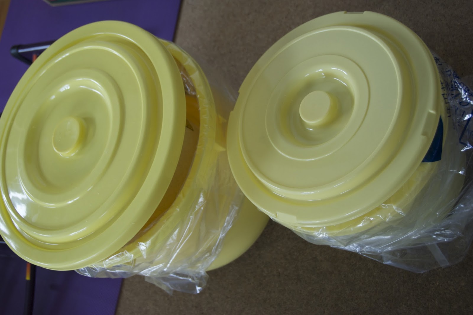現時点ではそれぞれの樽に重しを載せているが、重しが足りないと思われる時は樽を2段重ねにすることもある。