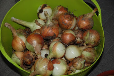 | 若干遅過ぎのタマネギ収穫。 保存がうまくいくかちょっと心配だ。 |