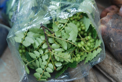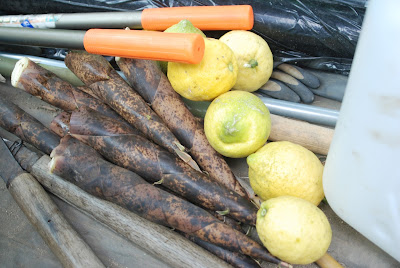 | このタケノコ美味しいのだが、灰汁抜きに湯掻くのに時間がかかるらしい。 収穫忘れのレモンも数個見つけたので持ち帰った。 |