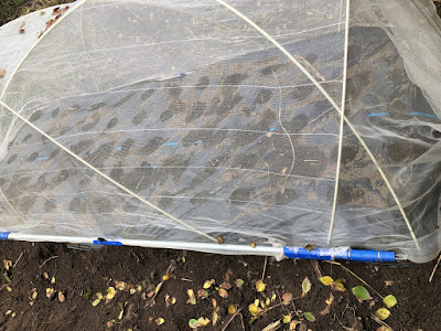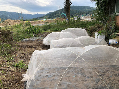 そして、それらをおこなう畝の多くは、虫被害に遭いにくいように1.5mほどの鉄パイプを防虫ネットの両端に置いた2m弱の小さな畝だ。