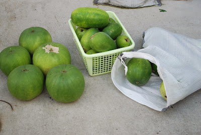 下の写真の、かごと土嚢袋に入っている冬瓜は細長い。