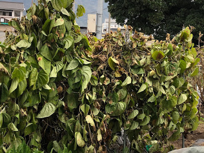 第1菜園の宇宙芋は12月末でもまだ青い葉がたくさん見られた。