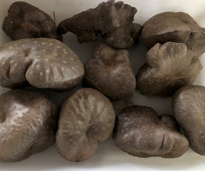 | 大きさも皆10cmクラスで、今年植えた9個の種芋より大きく、個性も豊かな芋たちだ。 この芋たちに種芋として頑張ってもらい、来年は更なる収穫を楽しみたいと思っている。 |