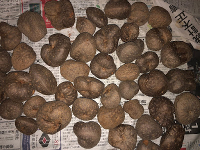 | 隕石のようで、眺めるのには楽しい宇宙芋。 ここの芋はすべて食用にしようと置いていたもの。 食べたり、料理したりするのに人気が出なかったので余った。 |