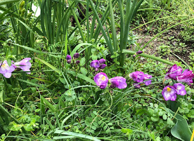 | 花壇ではこんな雨でも春の花たちが頑張って咲いている。 こちらは、フリージア。 |