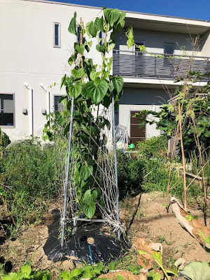 | こちらはツルムラサキや四角豆の苗が近くにあるが負けていない。 |