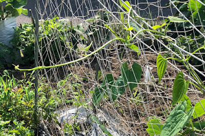 で、こんな蔓の先端は隣の支柱の竹先ごと切って、元々の畝の方に戻しておいた。