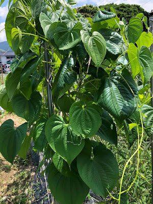 | 第1菜園の宇宙芋の苗もかなり大きくなってきた。 もしかしたら、ムカゴや、雌花、雄花があるのではと苗を見て回ったのだ。 |