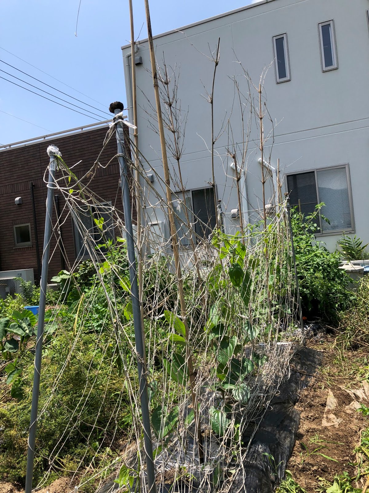 で、こんな蔓の先端は隣の支柱の竹先ごと切って、元々の畝の方に戻しておいた。