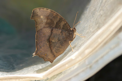 先日、果樹園で見かけた枯葉に似ている蝶が今日は菜園でも飛んでいた。