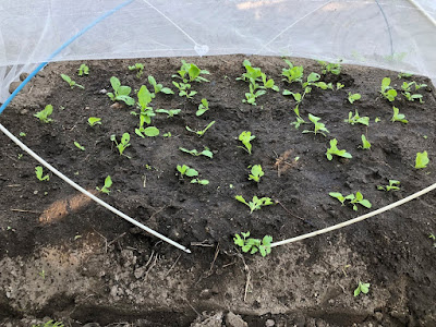 | こんなに混み合った苗は大幅に間引きした。 この防虫ネットの外側にはコオロギの姿が見えるが中には入れない。 |