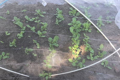 | この後は、元どおり完全密閉型で見ていくことにしている。 時に見回りをして、もし食べられている苗があったら、すぐ根元を掘り起こそう。 |