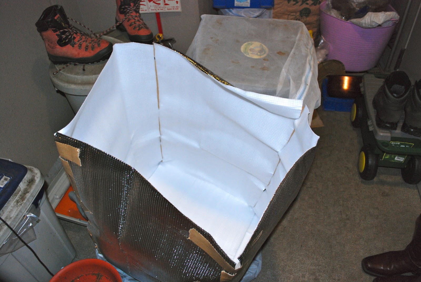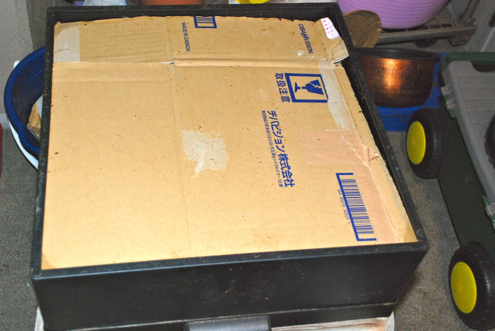 | これが室コン5号の上に置いている段ボールの蓋。夏の暑い日に見られた脱走兵はこの段ボールの蓋の上や室コン壁の内側上方に多く認められた。今回ここには脱走兵は認めていない。 |