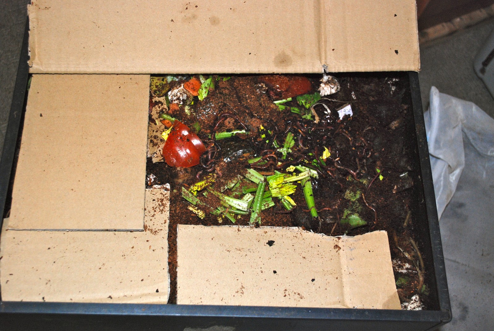 | 写真で分かりにくいが脱走兵をミミズ小屋に返したところ。特に弱っているようなミミズはいなかった。夏の暑いときの脱走兵は皆弱っていたので、今回の脱走劇の原因が室コン内の悪条件の発生だとしても心配な程のものではなさそうだ。 |