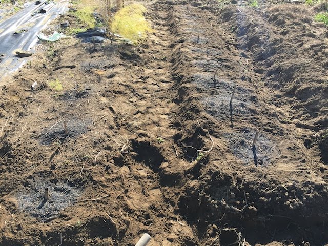 | 土嚢袋から畝に移植した苗十数本に焼いた籾殻を掛けたところ。 この後、マルチも掛けておいた。 |