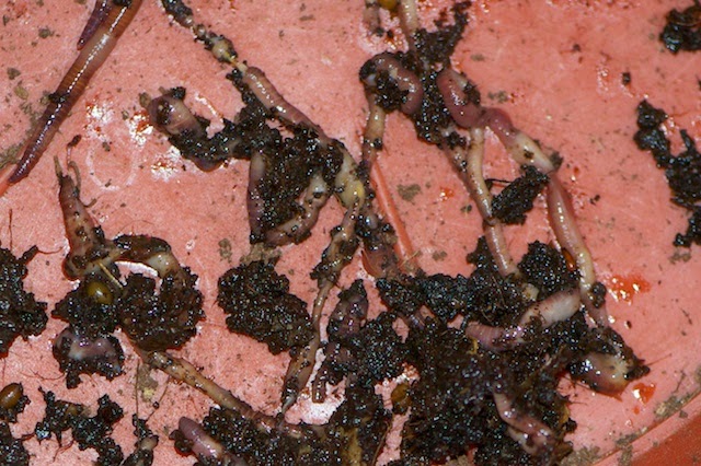 | ちょっと引っ張ると千切れてしまうようなミミズ。 それでもまだ動いているので全く死んでいるわけではないようだ。 |