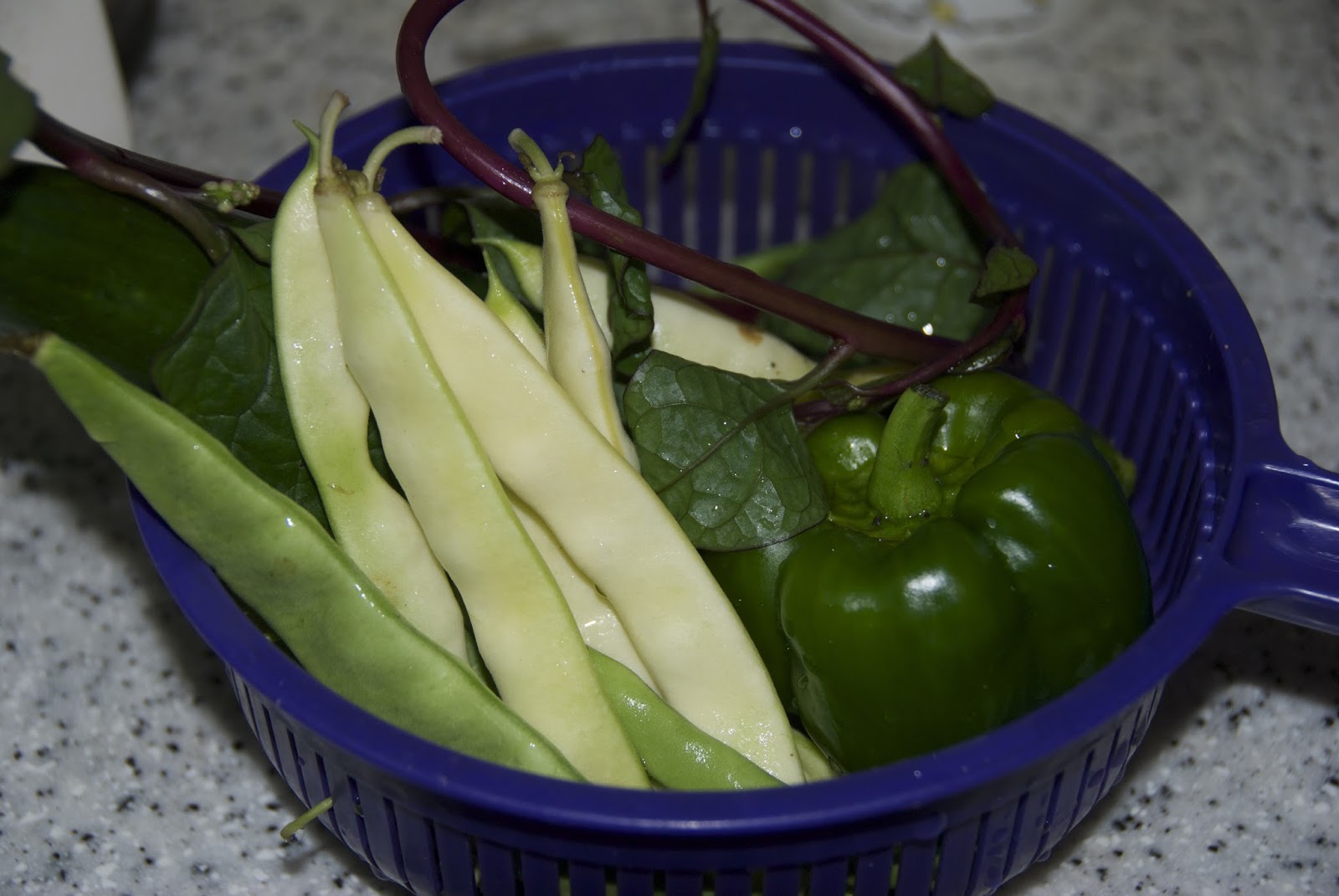 | 黄色のインゲンはスペインの土産にもらった種を5月の終わりに植えたもの。 食感は日本産の緑色のモロッコと変わりなかった。 |