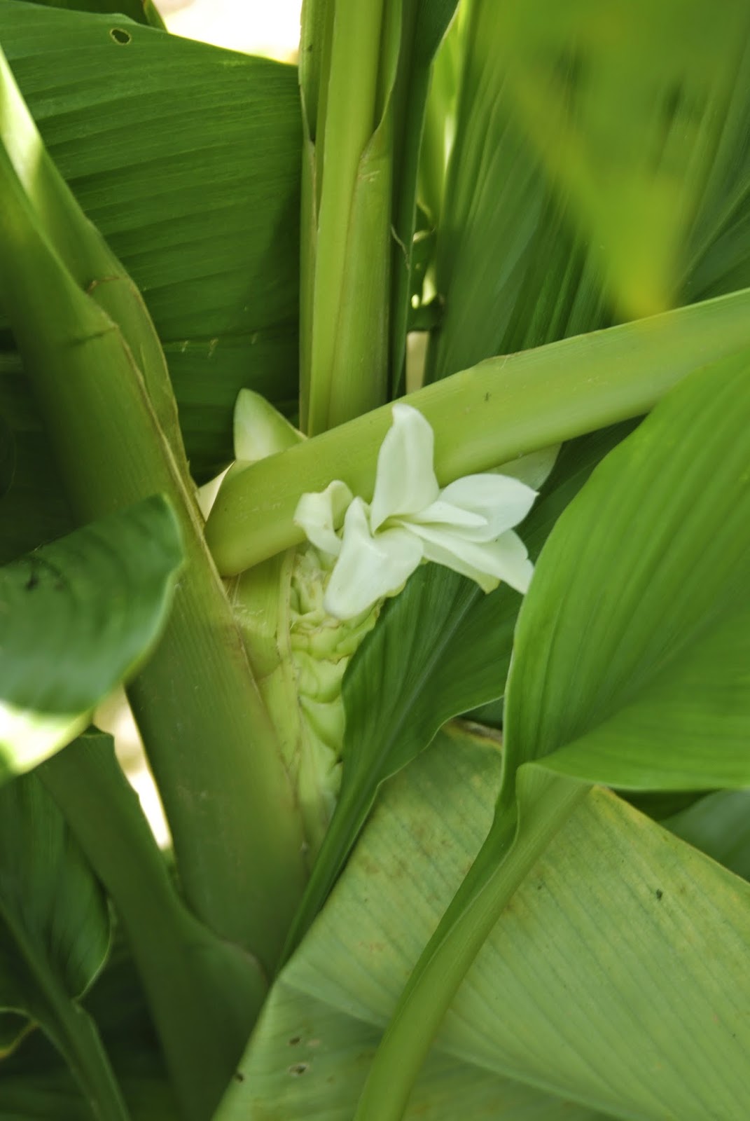 | 葉の茂りが凄いのでちょっと見た目には花の姿は目に留まらない。 葉の高さは1m50cm以上になり、順調な生育だ。 発芽が遅いと思ったウコン、今年もどうやら順調のようだ。 |