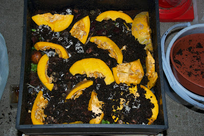 | 表面に見えるのはカボチャ。腐れる直前のカボチャはミミズ君の大好物だ。 |