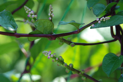 | ツルムラサキは葉や蔓を食べるのが一般的のようだ。 ただ、この写真のような花芽を集めて食べるのも美味しい。 蔓は緑のものと紫のものがあるようだ。我が家にあるのは蔓紫だ。 |