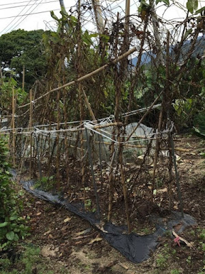 この畝のツクネ芋、7月中旬頃2mの高さに達し、その後もだんだん頭でっかちに成長していた。