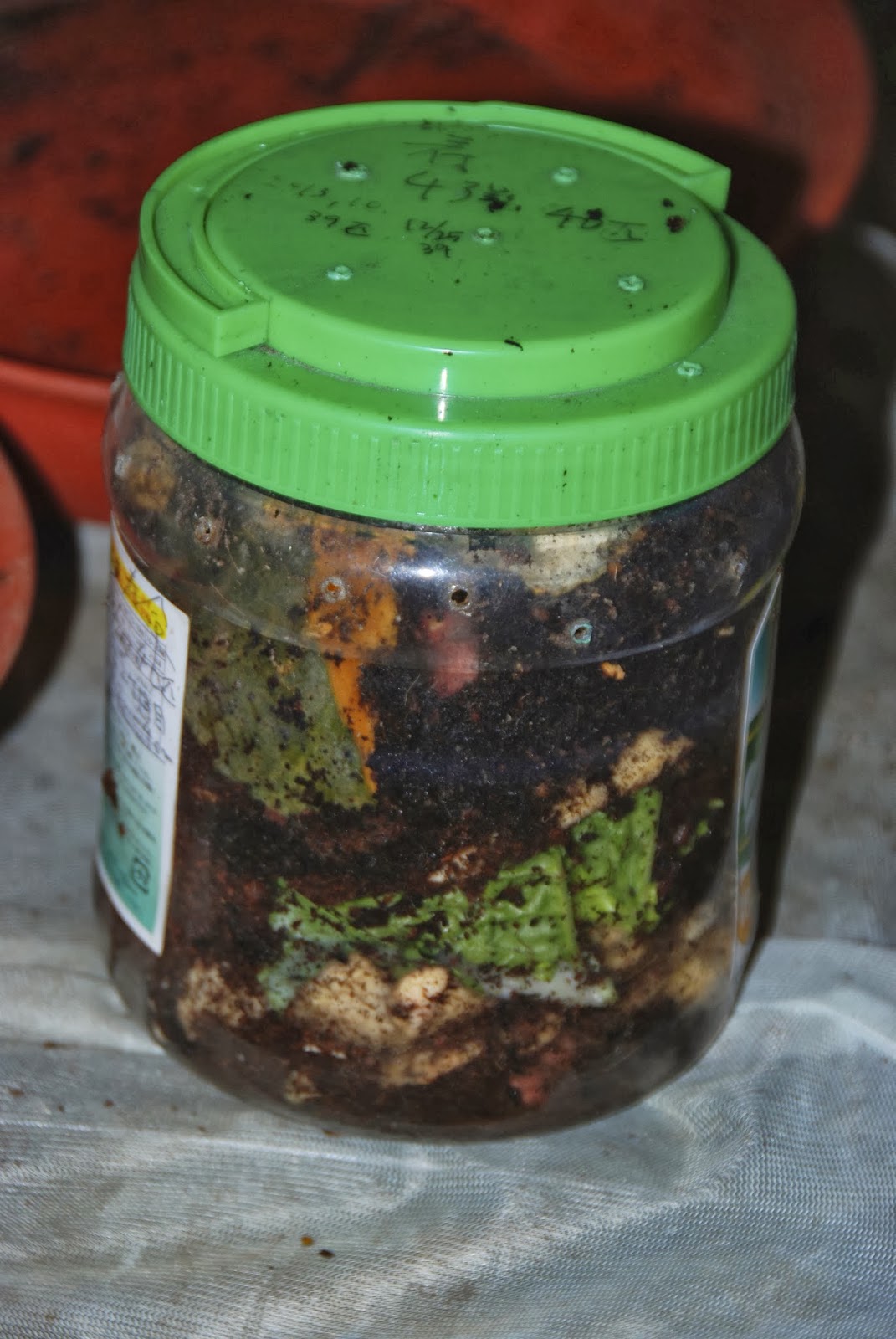 | ウェットな内容をチェックしてみて分かった。 先月餌として入れた解凍後のキクイモがベチャベチャ状態になっていた。 やはり解凍後の餌は少なめに与える必要がありそうだ。 食べ残しが多かったがサツマイモの皮などのお陰で環境が何とか保てたのだろう。 |