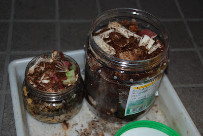 | 左が元々の小屋。右が5倍程ボリュームの大きな小屋。両方の小屋ともみみず君の数に対し餌は十二分に与えたつもりだ。 特に太りやすい芋類なども入っており、小さい方の小屋でも1ヶ月では食べきれない量だと思われる。 |