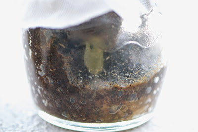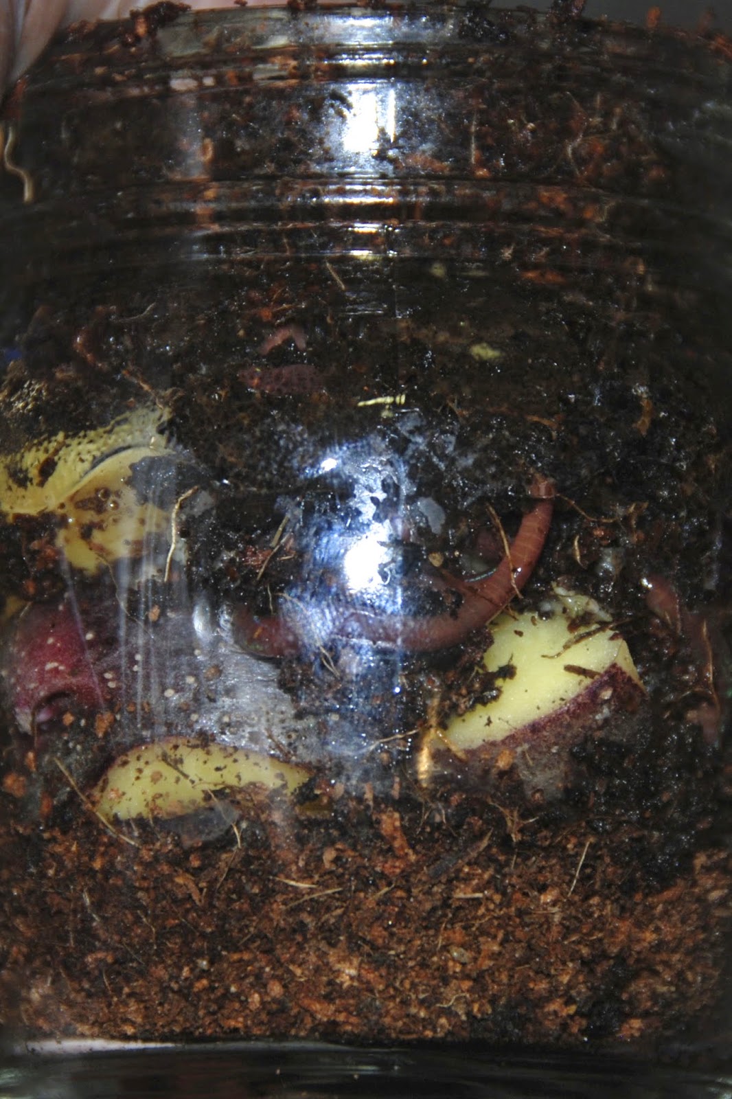 | やはり小さな瓶でみみず君を育てるのは大変そうだ。 設定10日目に環境が悪化しかけた、10匹の子供ミミズは元気だった。 ココ繊維ををドライなものに入れ替え、大きな梅を1個入れていた。 |